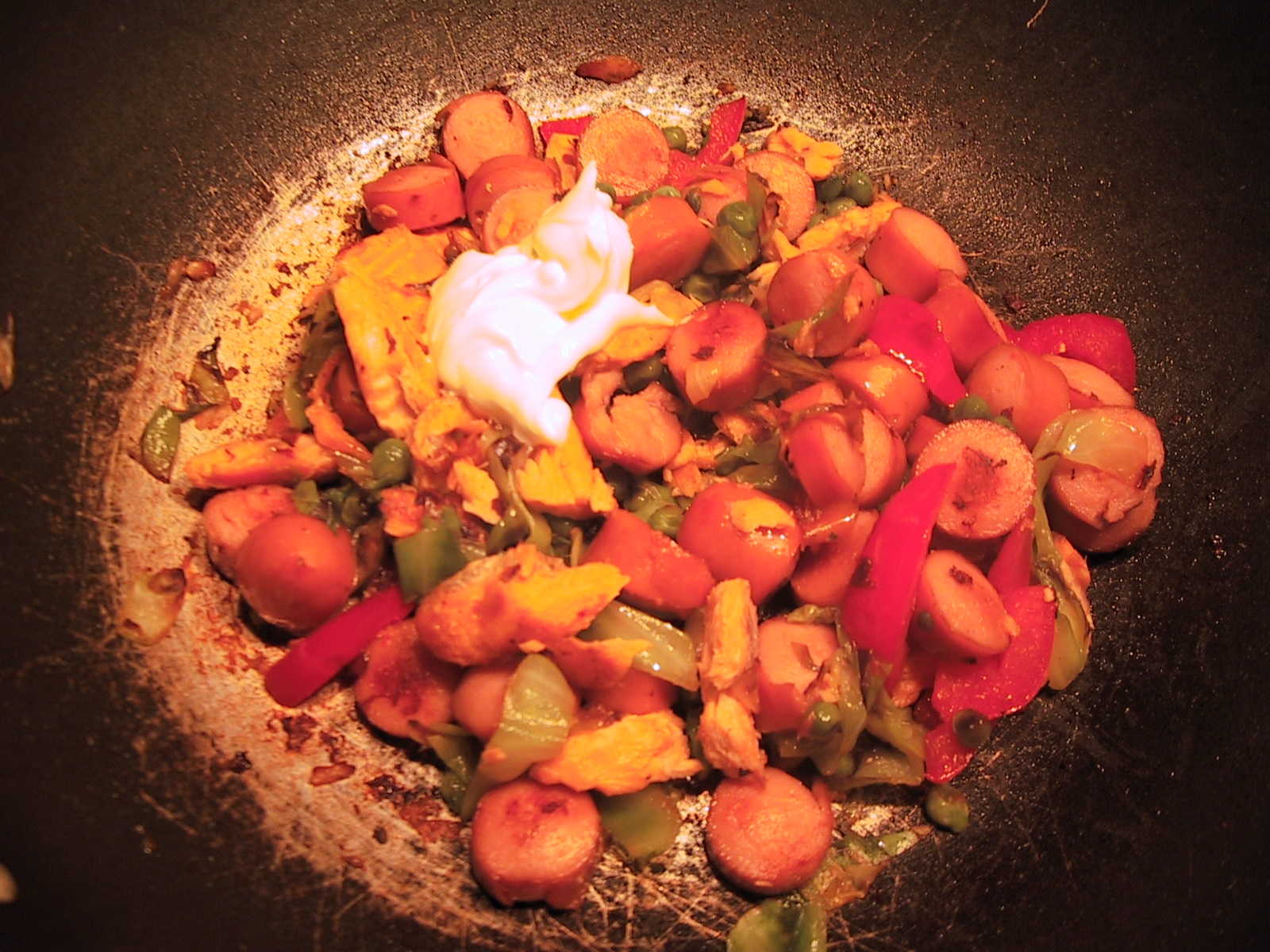 Wok with salmon and wieners,